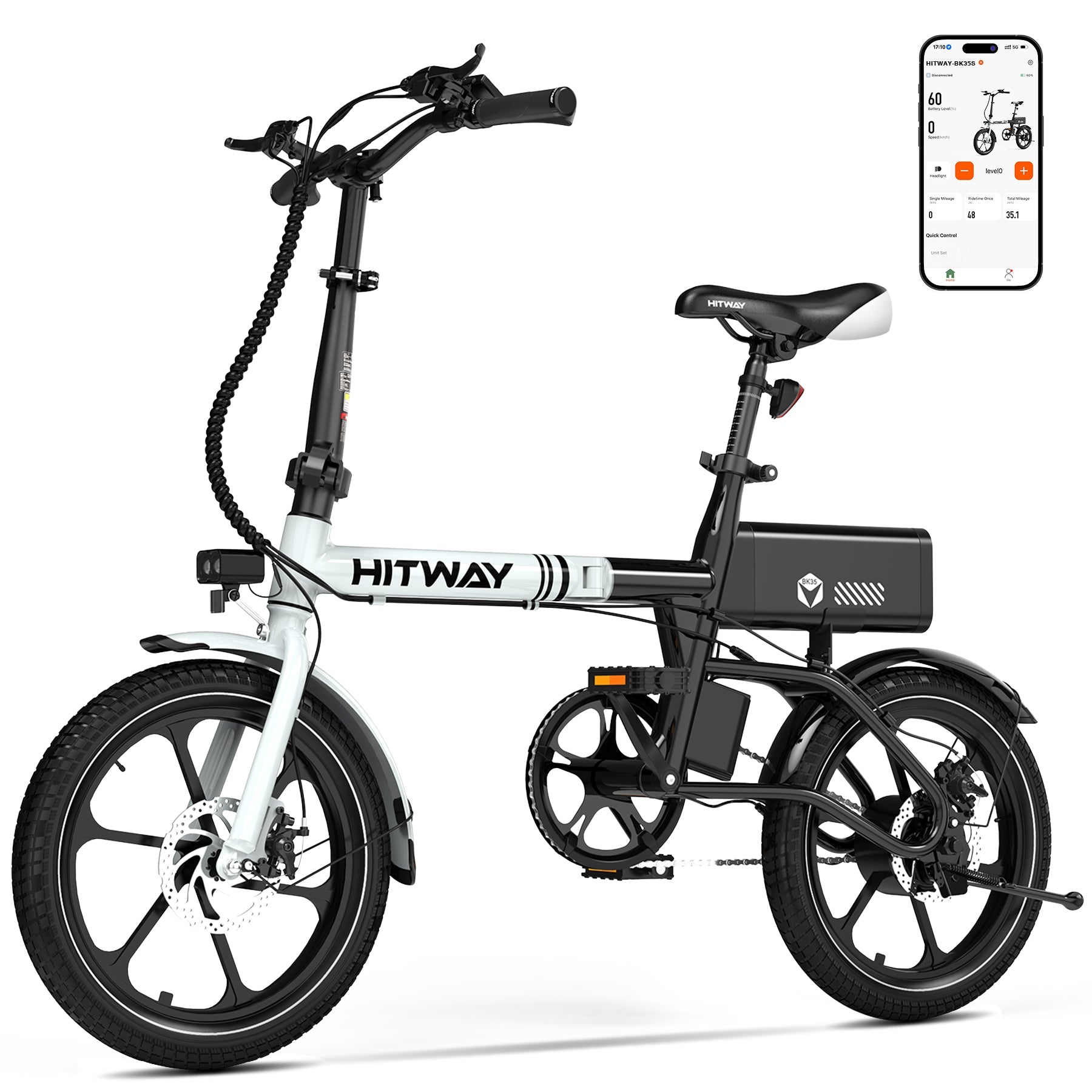 The BK35S features wider 16×2.5-inch tyres that provide stability and comfort over city streets and uneven surfaces. A handlebar-controlled front LED headlight improves visibility during low-light rides, while the stylish S869 full-colour LCD display keeps you informed of speed, battery level, distance, and riding mode at a glance. Bluetooth connectivity allows integration with the HITWAY App for ride tracking, system diagnostics, and remote unlocking.